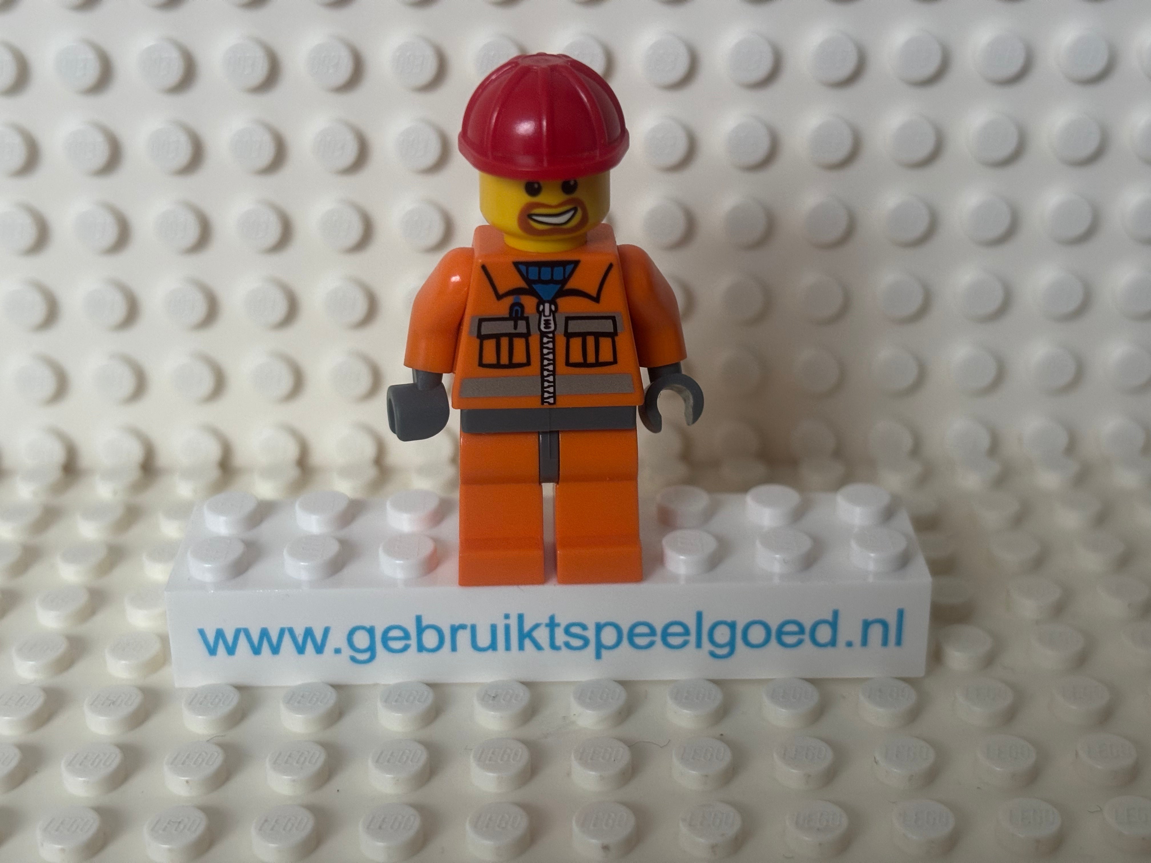 Minifig cty0041 - Construction Worker - Orange Zipper, Safety Stripes, Orange Arms, Orange Legs, Dark Bluish Gray Hips, Red Construction Helmet